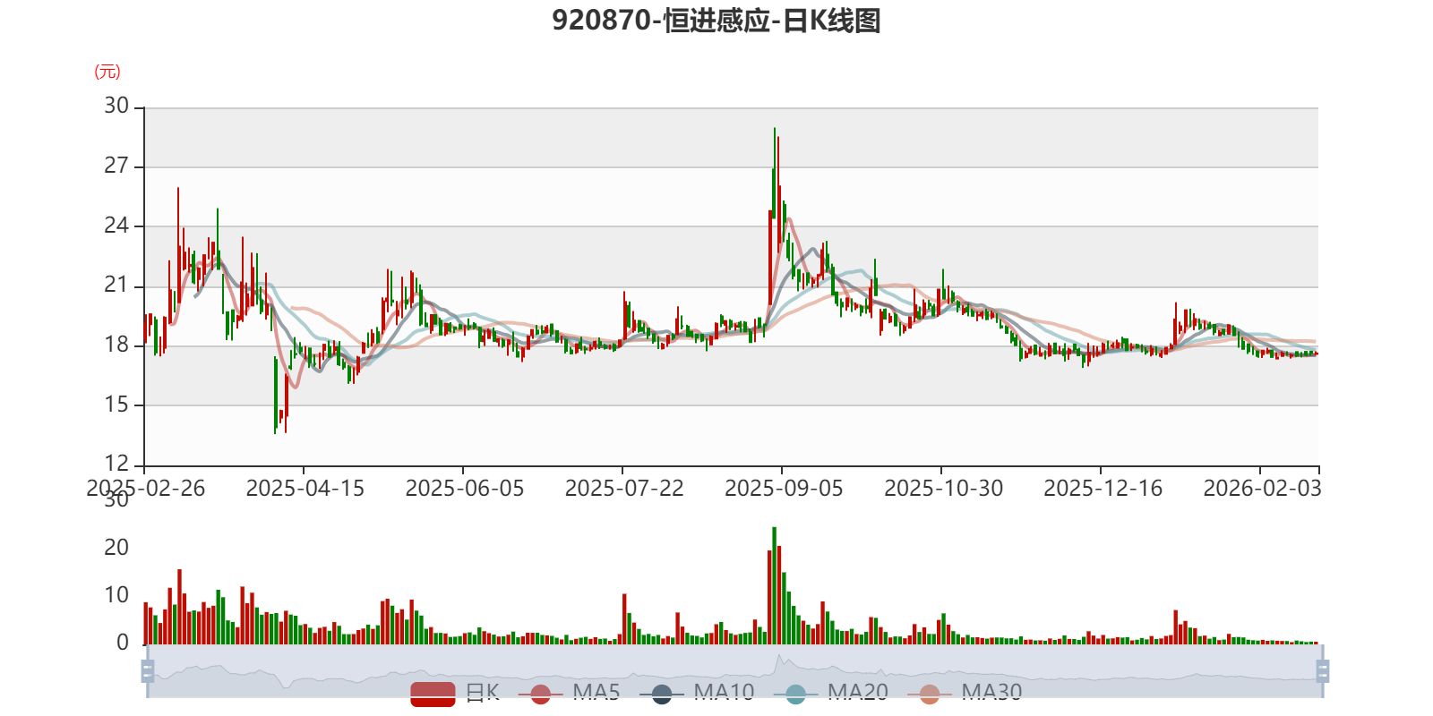 中证智能财讯恒进感应(920870)2月26日晚间披露2025年业绩快报,公司实现营业收入9677.61万元,同比增长8.25%;归母净利润1658.78万元,同比下降22.84%;扣非净利润1026.6万元,同比下降34.03%;基本每股收益0.12元,加权平均净资产收益率为3.68%。以2月26日收盘价计算,恒进感应目前市盈率(TTM)约为142.42倍,市净率(LF)约5.29倍,市销率(TTM)约22.03倍。