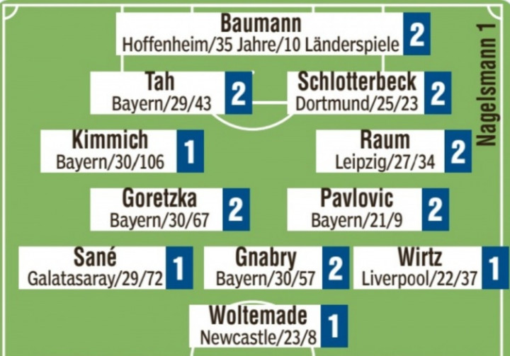 中场:格雷茨卡(2)、帕夫洛维奇(2)、萨内(1)、格纳布里(2)、维尔茨(1)